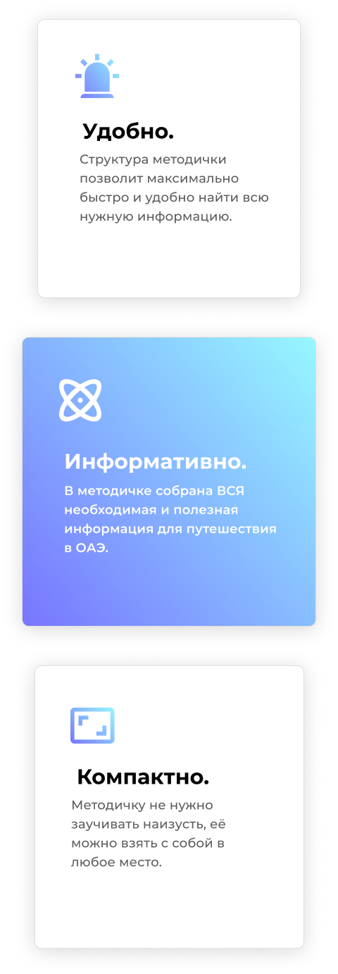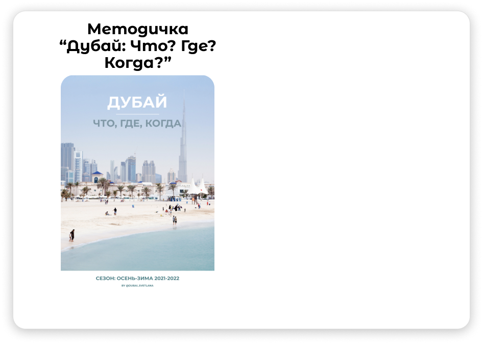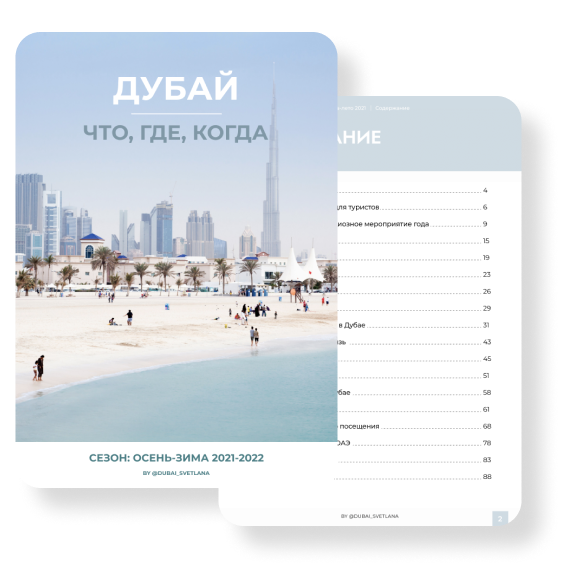 Методичка создана основателем туристической компании и наполнена всей информацией, что может понадобиться: актуальные правила въезда в ОАЭ, новые достопримечательности, что взять с собой, погода, отели, правила страны и въезда в неё и многое другое. Помимо основной информации, Вы сразу сможете посмотреть события на ближайшие месяцы и информацию об экскурсиях.